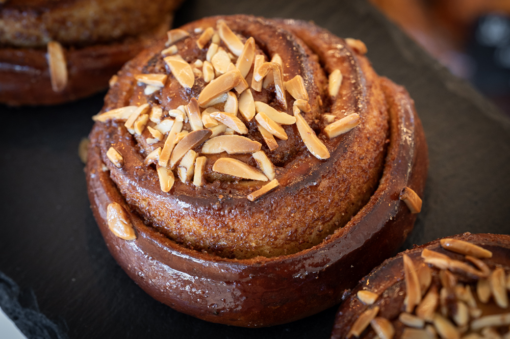Soft and buttery, with the perfect swirl of cinnamon and a sprinkle of golden slivered almonds on top.